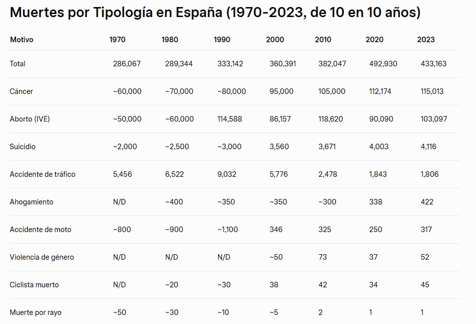 Fuentes: INE (total, cáncer, suicidio), Ministerio de Sanidad (aborto), DGT (tráfico, moto, ciclista), RFESS (ahogamiento), Ministerio de Igualdad (violencia de género), AEMET/INE (rayo).